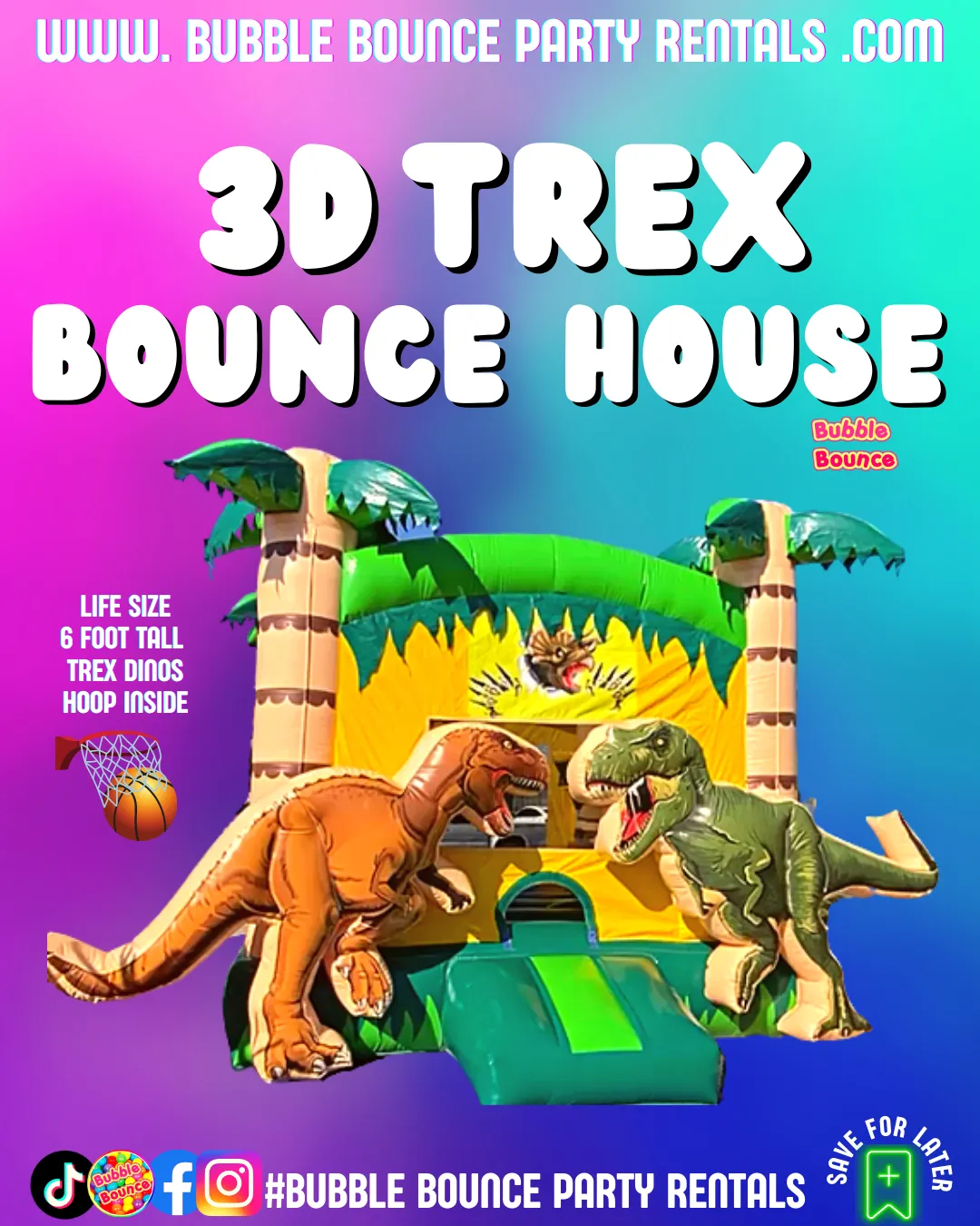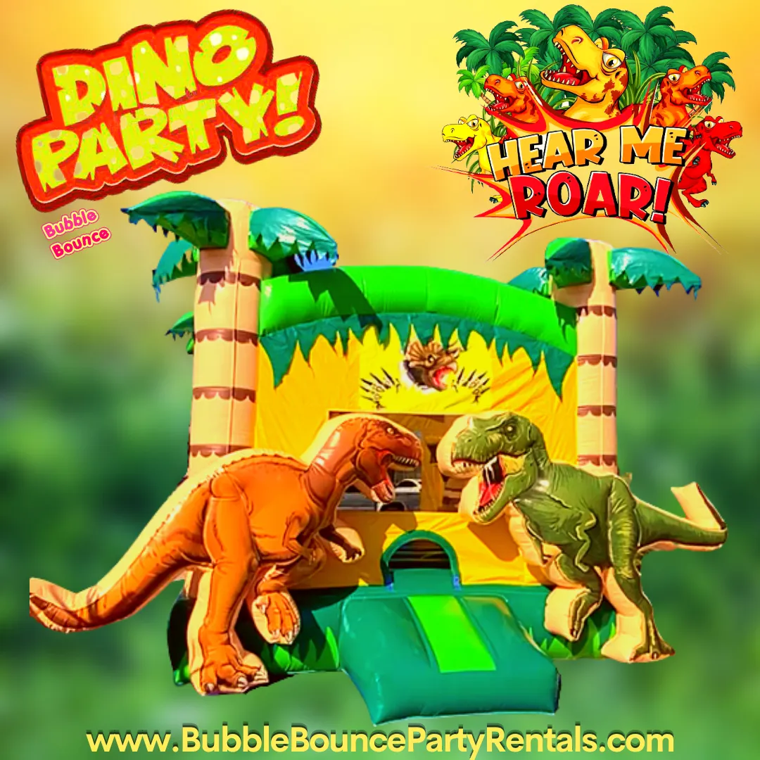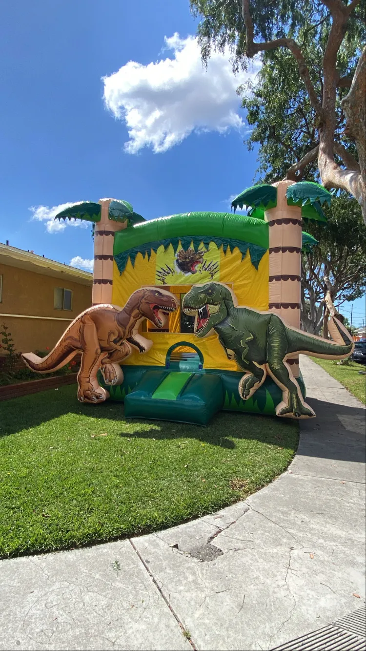 Get ready for a prehistoric party with our 3D Double T-Rex Jurassic Bounce House! This massive 17′ x 17′ inflatable features towering 6-foot-tall 3D dinosaurs, a spacious jumping area, and an inside basketball hoop for endless fun. Designed with commercial-grade vinyl, large enough for both kids and adults to enjoy!
