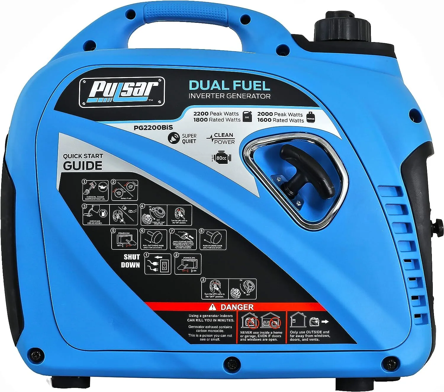 The right combination of convenience and versatility are key when shopping for your next portable generator, and Pulsar’s PG2200BiS is sure to have just what you need. This incredible 2,200 peak watt Dual Fuel Inverter generator with its compact, light-weight design is perfect for camping, tailgating, and other outdoor recreation. Featuring a user-friendly direct connect USB port to provide you with a safe and clean electrical current for powering sensitive electronics. Dual Fuel capability lets you choose between operating on gasoline or liquid propane fuel sources, and Quiet Inverter technology makes it virtually silent from as little as 10 feet away. With an impressive 8 hour run-time on single tank of GAS/ 75 minute run-time on 1 lbs LPG tank and parallel capability, the PG2200BiS is the ideal portable generator.